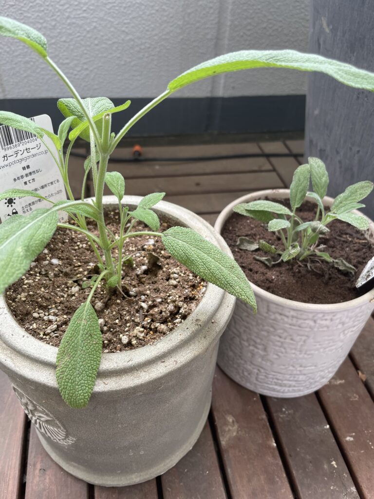 その隣で、こっちは普通の植木鉢だけど、セージも育ててる。