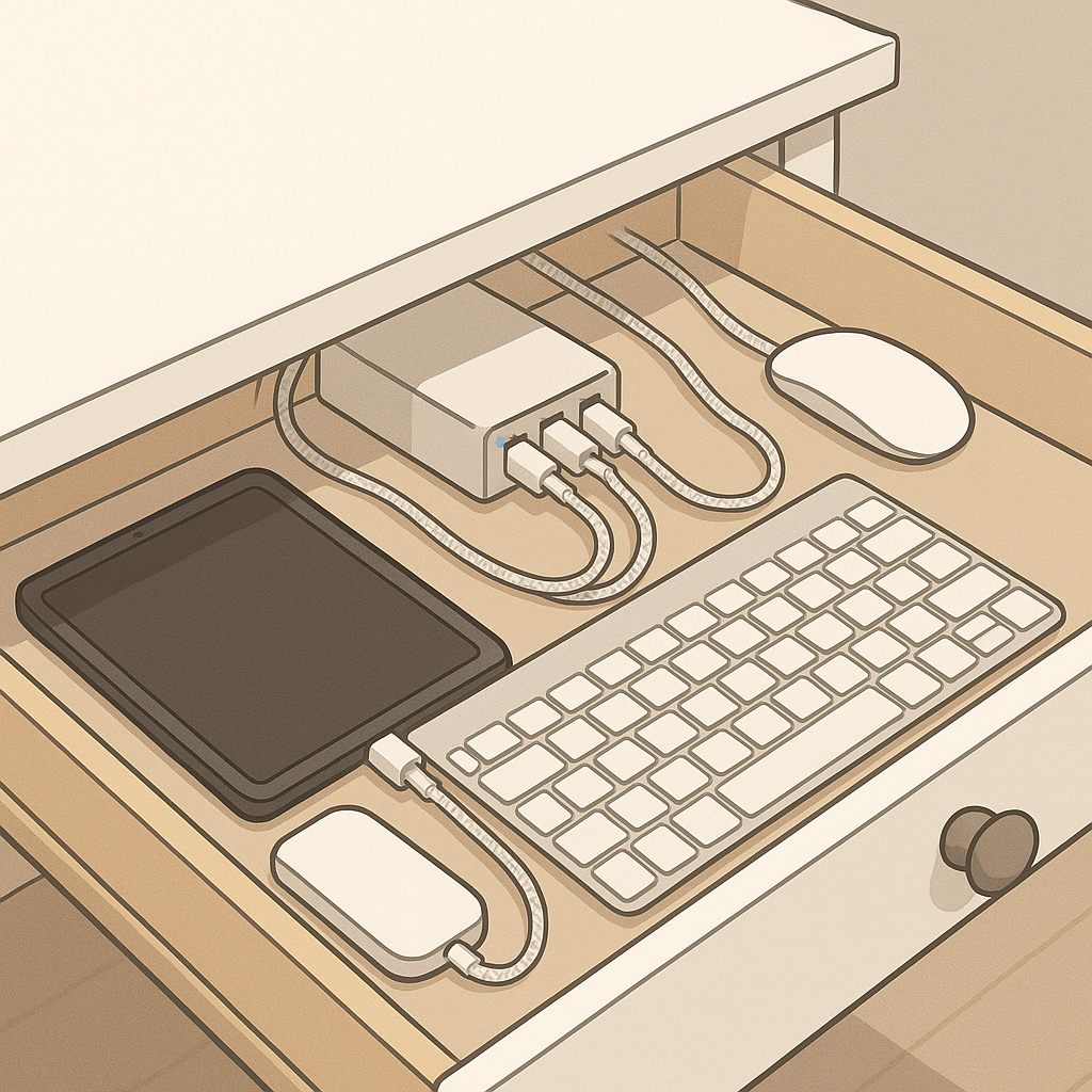 デスク周りの配線やケーブルは、気づくとごちゃごちゃして生活感が出てしまう。見た目にも落ち着かないし、掃除のときにも邪魔になる。そこで引き出しの中を充電ステーションにしてみたところ、驚くほど快適になった。ここでは実際にやってみた工夫や気をつけた点をまとめる。