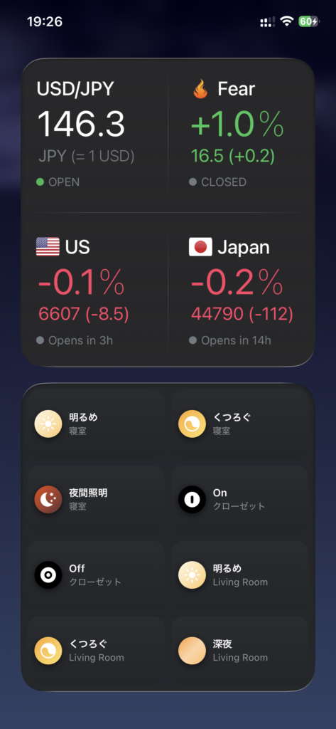 さらにウィジェット画面には、株価指数とHueの照明コントロールを配置。マーケットの動きと家の照明をワンタップで操作できるようにしている。