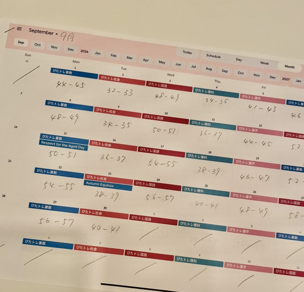 国語・算数・社会・理科・漢字の5冊をバランスよく配置したら、ちょうど学期末に範囲が終わる計算になりました。