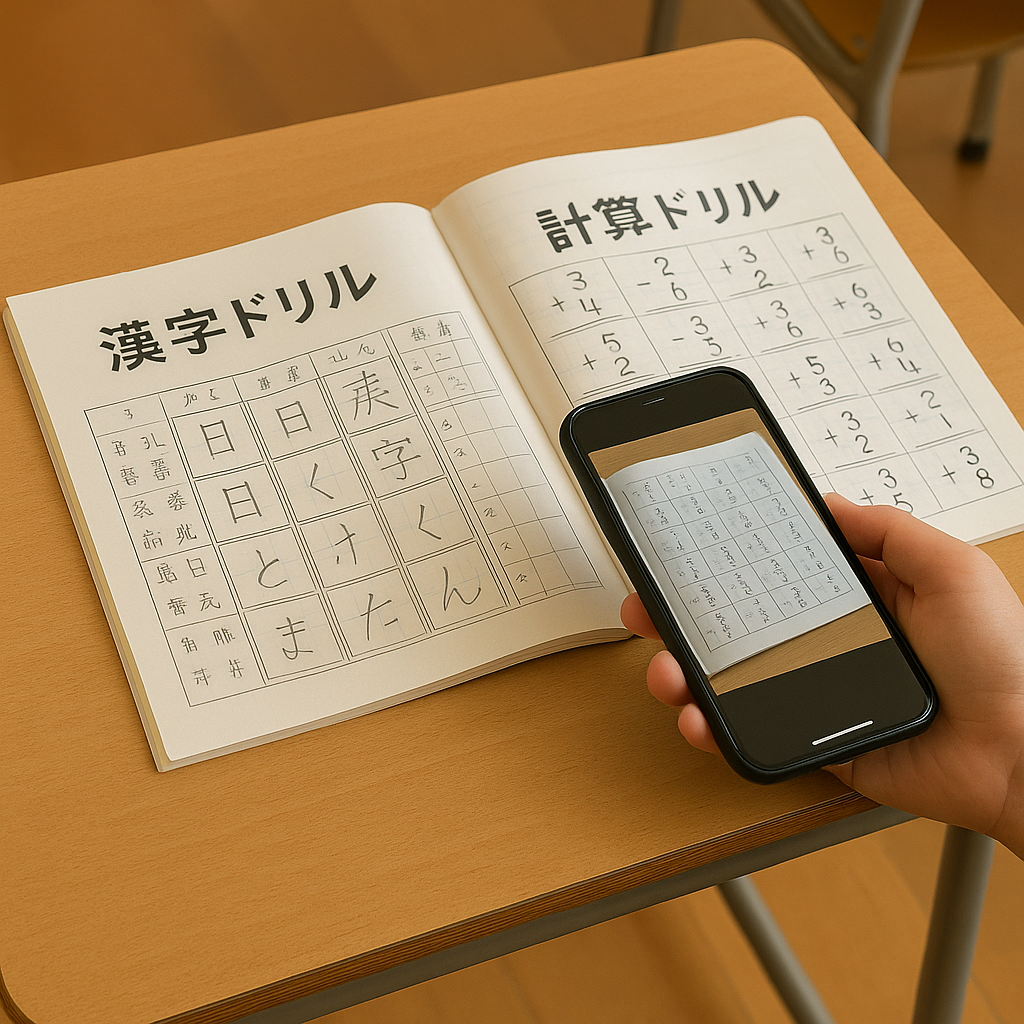 我が家ではスマホアプリのvFlatScanを使っている。斜めから撮っても自動で台形補正・湾曲補正をしてくれて、きれいに四角いデータになる。紙のドリルをそのまま電子化できるので、印刷すれば漢字ドリルや計算ドリルとほぼ同じように使える。スキャンしたデータはiCloudに保存している。